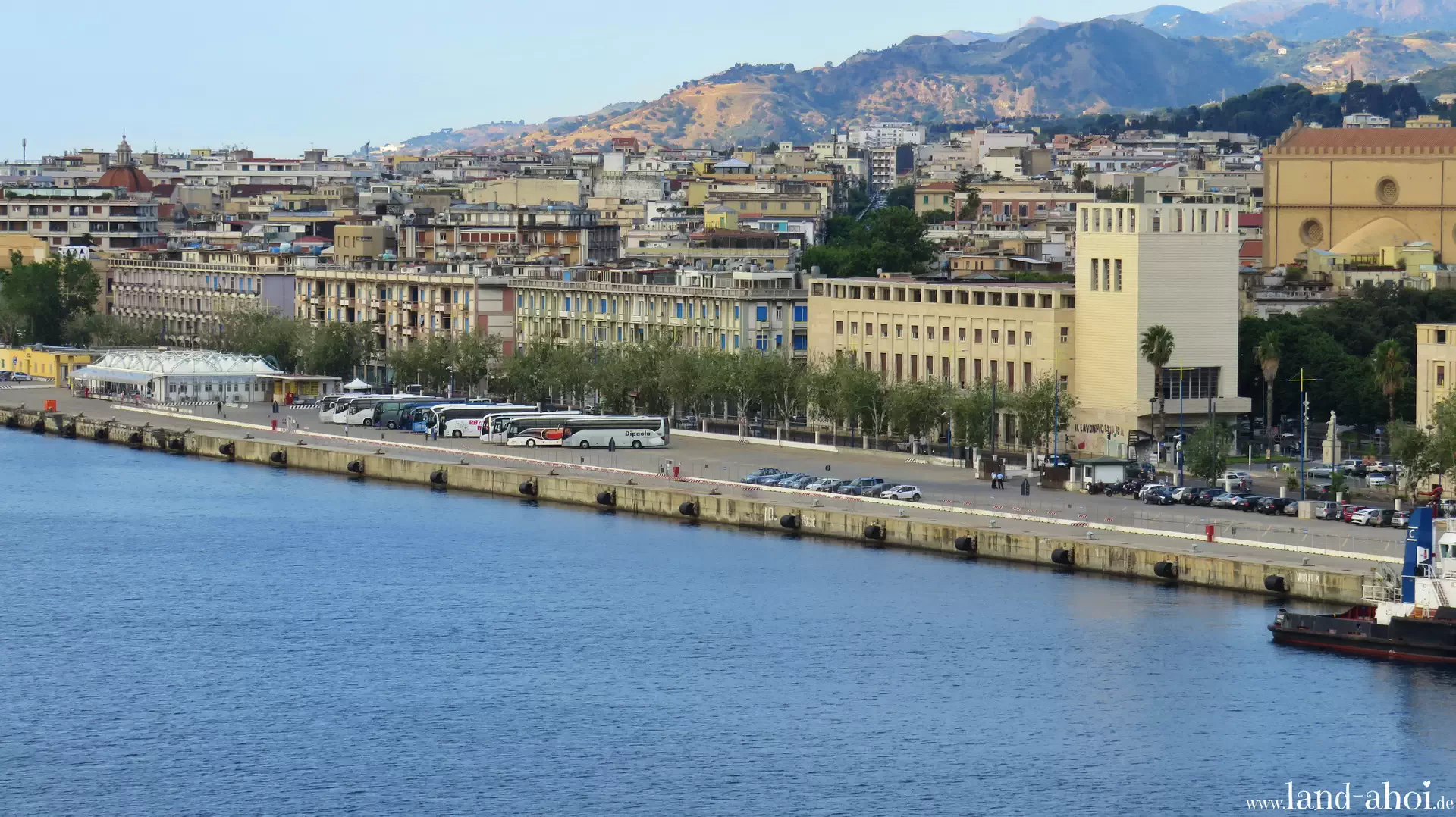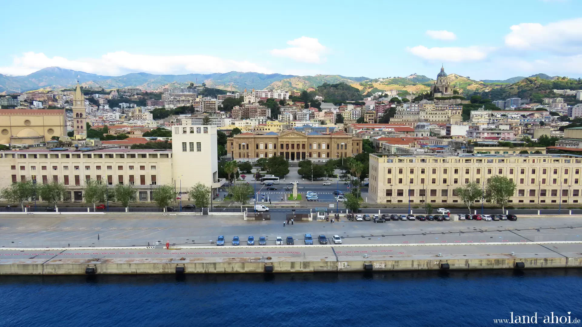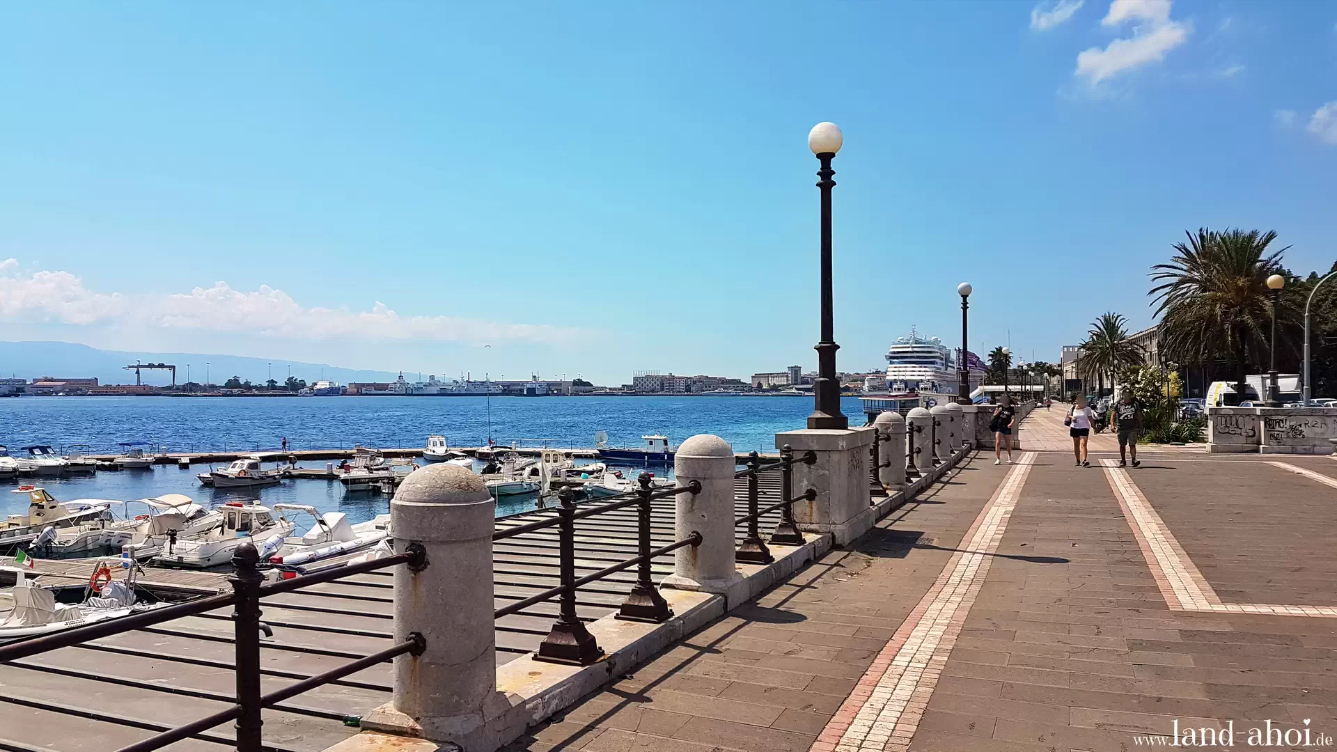 Die 32 Kilometer lange Meerenge Stretto di Messina (Straße von Messina), trennt die drittgrößte Stadt Siziliens vom italienischen Festland. Messina selbst befindet sich an der nordöstlichen Spitze der Insel und stellt in seinem sichelförmigen Hafen mehrere Liegeplätze für Kreuzfahrtschiffe bereit. Diese liegen in der Regel hintereinander an dem zur Straße Via Vittorio Emanuele II parallel verlaufenden Kai.